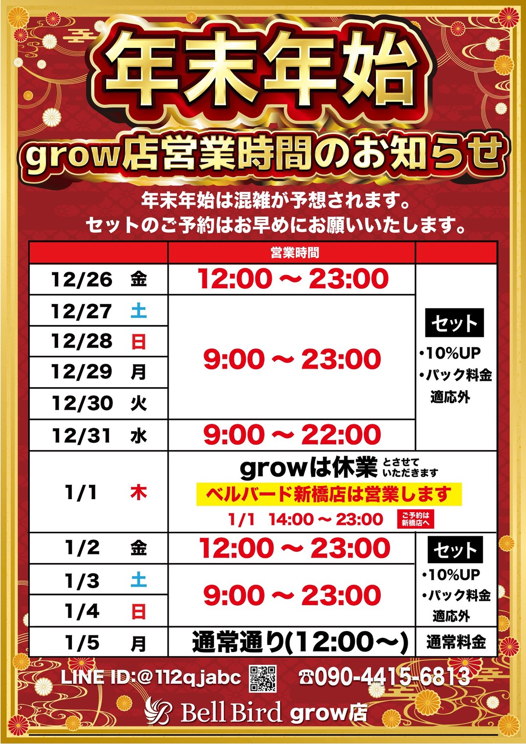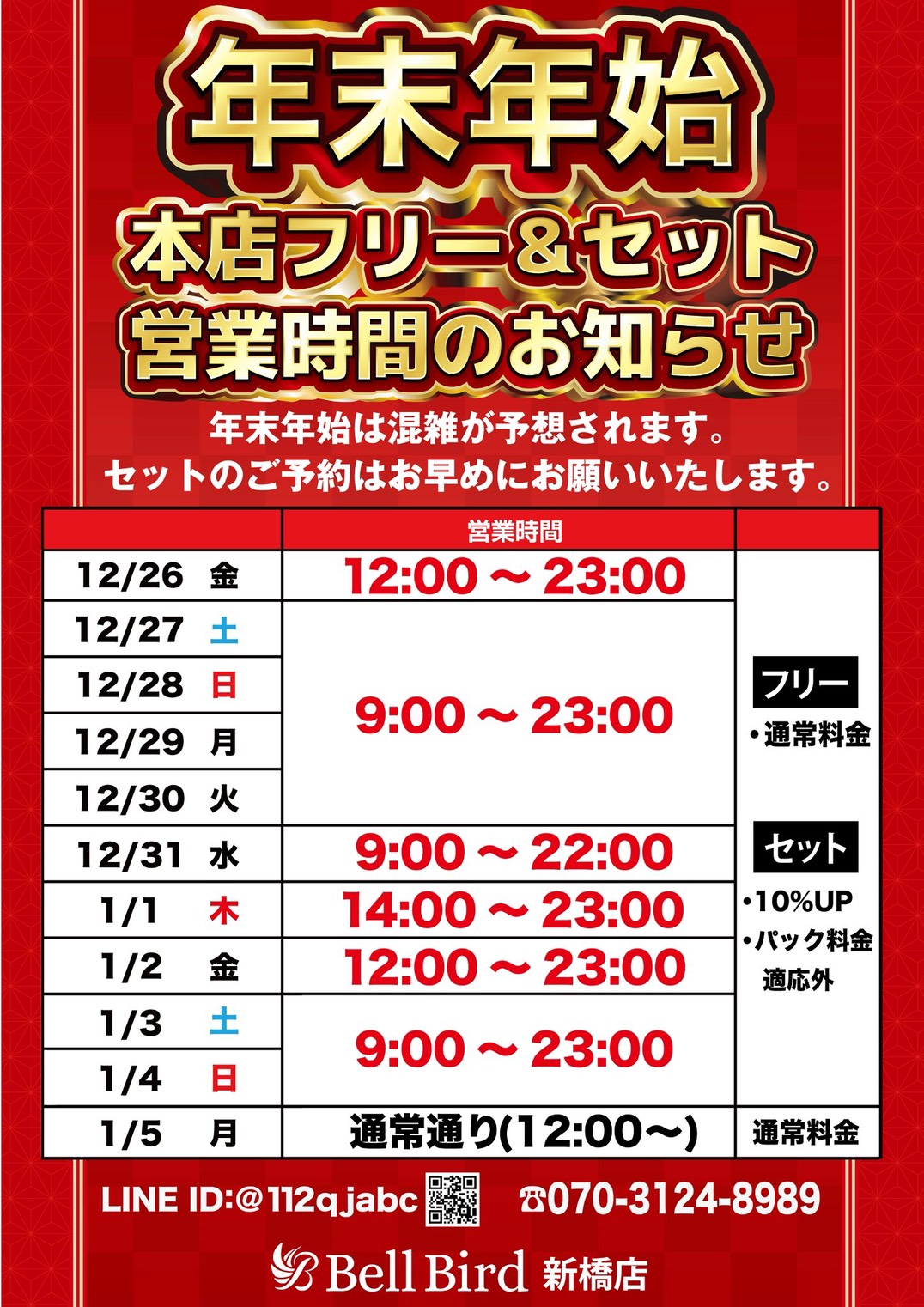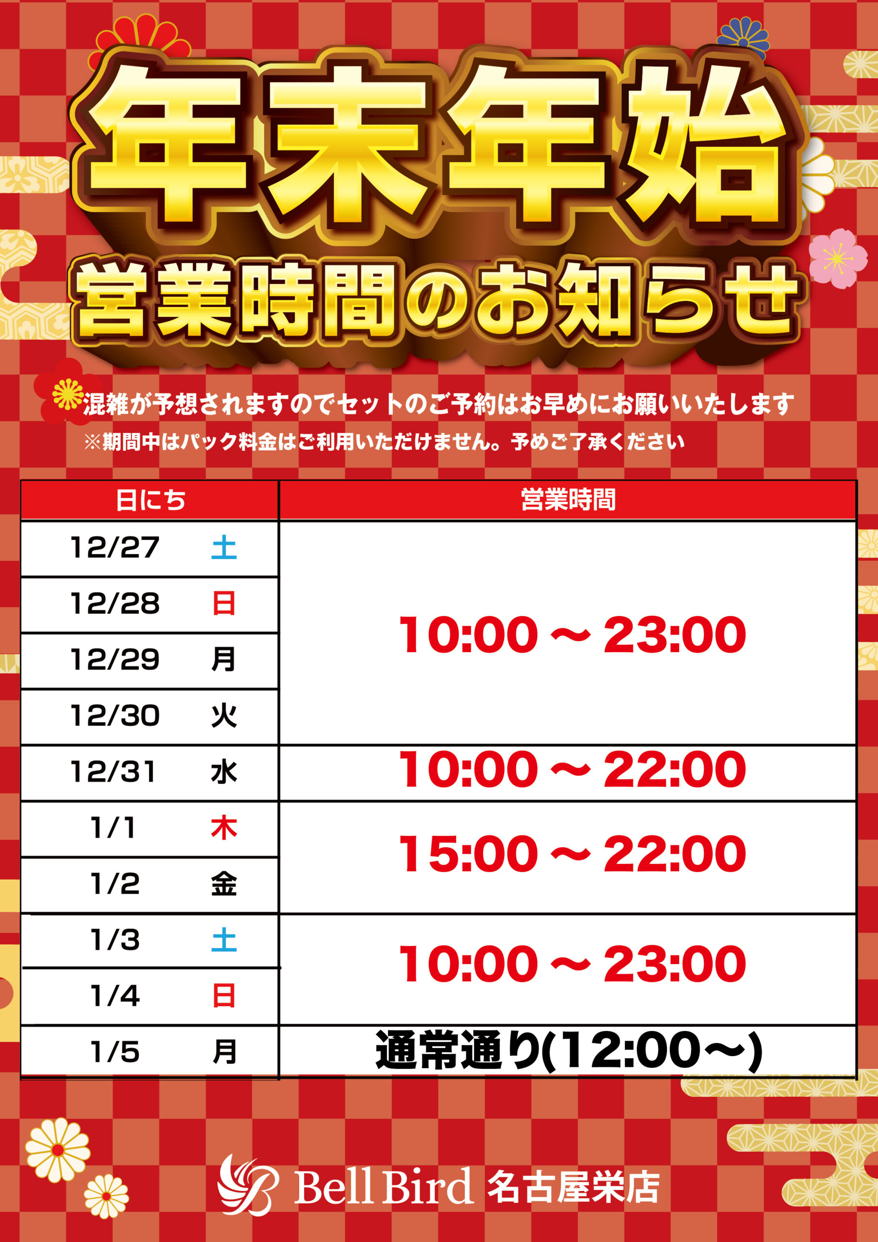 麻雀ベルバードでは下記期間につきまして営業時間を一部変更させていただきます。